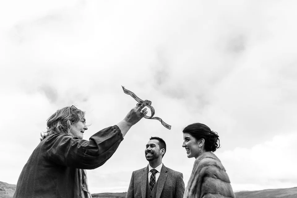 We exchanged vows in the Fairy Glen, on the Isle of Skye, Scotland. The Fairy Glen is a hidden area in the hills East of Uig. While difficult to spot from the single lane road leading there, up over the hills one finds a truly magical place. The Ceremony was around 1pm at the base of a waterfall. Sonja Eckl-Riel performed a traditional Celtic ceremony and we wrote our own vows. Lea Macleod played the bagpipes as we walked in and throughout the ceremony.